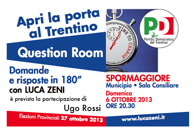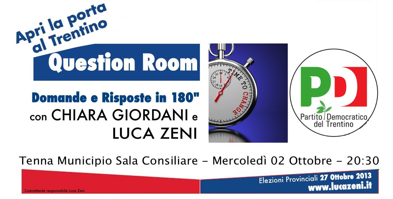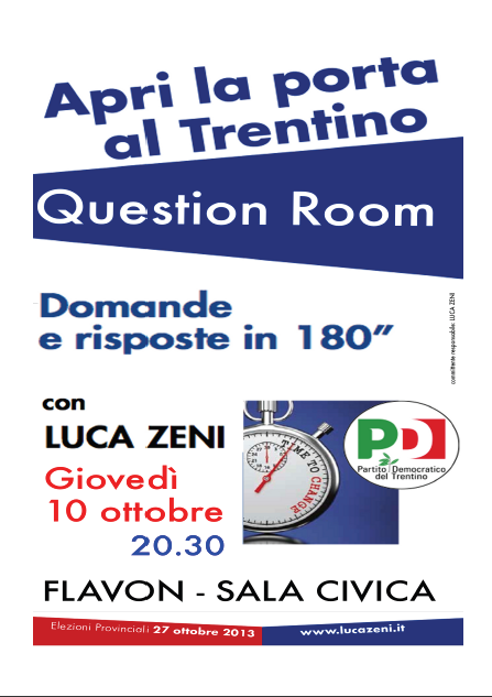Domande e risposte rapide per confrontarsi in maniera concreta e diretta, senza i lunghi comizi a cui spesso la politica ci ha abituato. Parleremo del futuro del Trentino con Luca Zeni del Partito Democratico. E’ prevista la partecipazione Ugo Rossi candidato Presidente per la coalizione di centro sinistra autonomista alle prossime elezioni provinciali del 27 ottobre 2013. Vi aspettiamo!!!