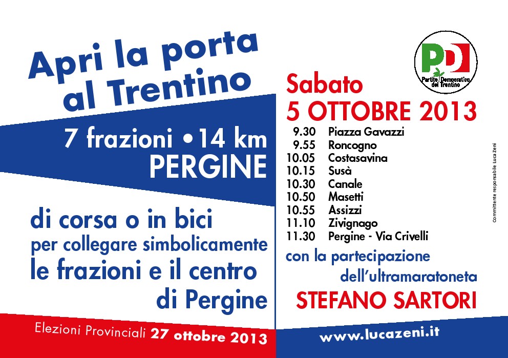 Ecco la rassegna stampa delle prime iniziative della campagna elettorale ottimamente riuscite. Trentino 9 ottobre 2013 – Question Room a Vigolo Vattaro Adige 8 ottobre 2013 – candidati PD Adige 8 ottobre 2013 – Anche il sindaco di Pergine nella foto dopo la corsa di Zeni Trentino 8 ottobre 2013 – candidati PD Trentino 8 ottobre 2013 – Zeni a Spormaggiore con Rossi Trentino 5 ottobre 2013 – 7 Frazioni, 14 chilometri, Una Pergine Adige 3 ottobre 2013 – Question Room a Tenna