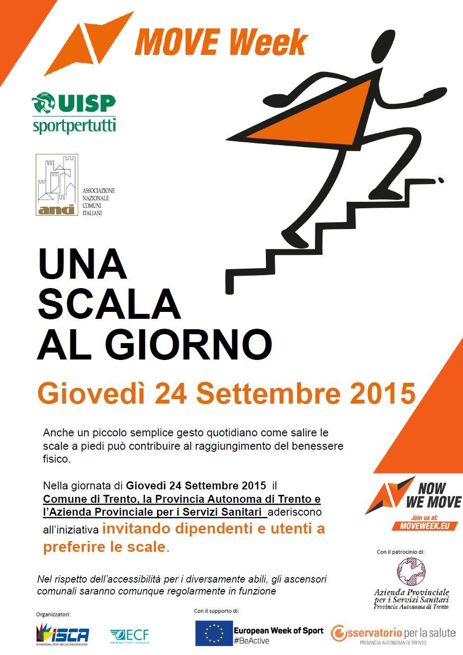 “Una Scala al Giorno” è un’iniziativa promossa da UISP in collaborazione con ANCI, che prevede l’invito a tutti i Comuni Italiani e altri EELL, ad esporre negli edifici pubblici un invito a non usare le scale (nel rispetto dell’accesso ai disabili). Questa iniziativa si terrà giovedì 24 settembre.