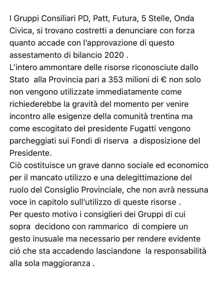 Cosa significa? Che prendono i 217 milioni e li lasciano in un fondo (che dovrebbe servire per le emergenze e gli imprevisti), al quale la giunta può attingere con discrezionalità, e spenderli senza prima aver avuto l’approvazione del consiglio provinciale.
