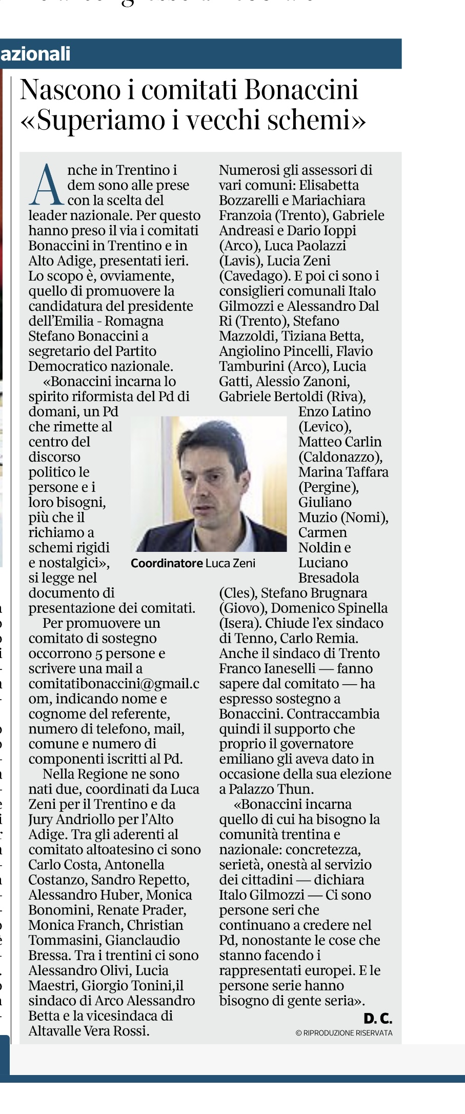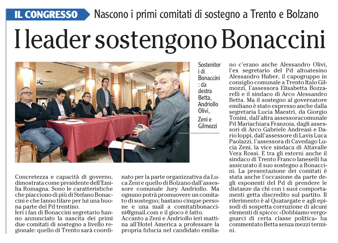 Chiunque volesse aderire al Comitato per Bonaccini del Trentino, può comunicarlo all’indirizzo email comitatobonaccinitrentino@gmail.com