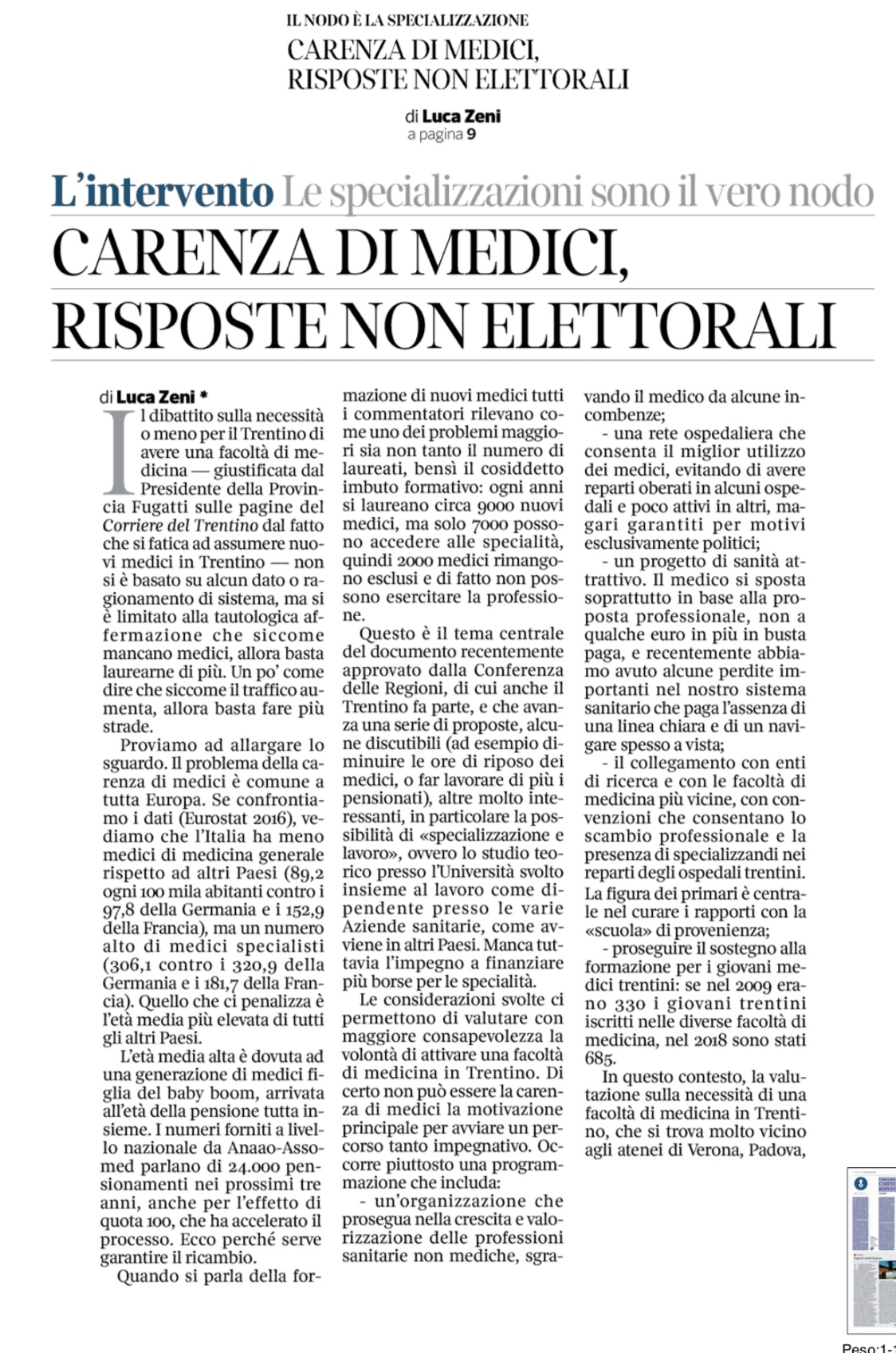 L’intervento pubblicato sul Corriere del Trentino sul tema della carenza di medici e sulla proposta di istituire a Trento una facoltà di medicina.