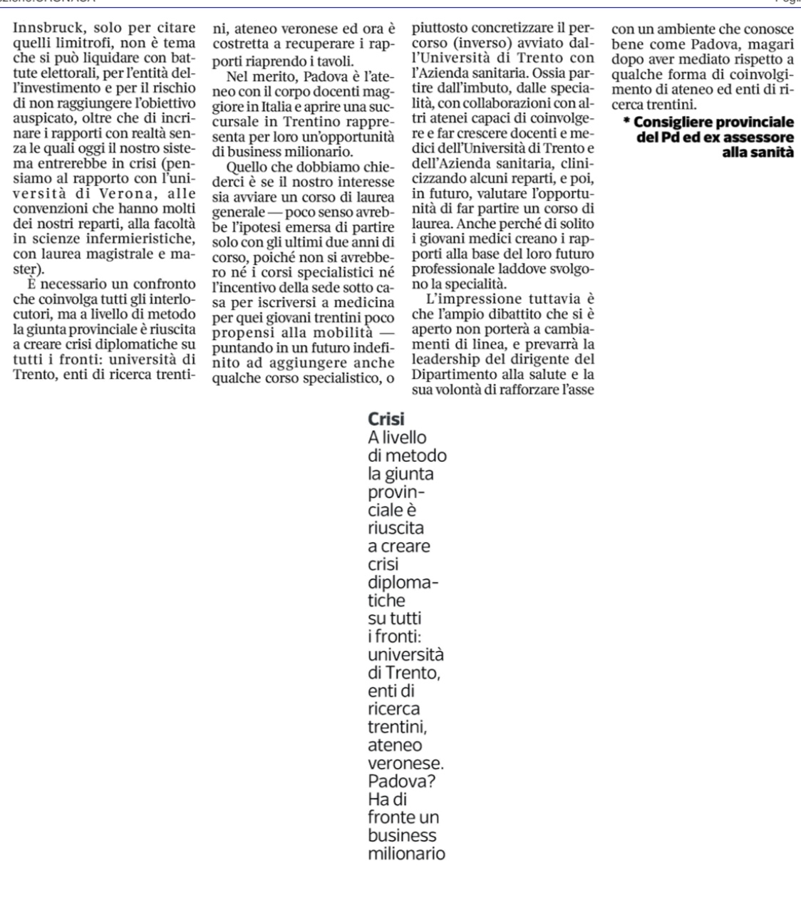 In questo contesto, la valutazione sulla necessità di una facoltà di medicina in Trentino, che si trova molto vicino agli atenei di Verona, Padova, Innsbruck, solo per citare quelli limitrofi, non è tema che si può liquidare con battute elettorali, per l’entità dell’investimento e per il rischio di non raggiungere l’obiettivo auspicato, oltre che di incrinare i rapporti con realtà senza le quali oggi il nostro sistema entrerebbe in crisi (pensiamo al rapporto con l’università di Verona, alle convenzioni che hanno molti dei nostri reparti, alla facoltà in scienze infermieristiche, con laurea magistrale e master).