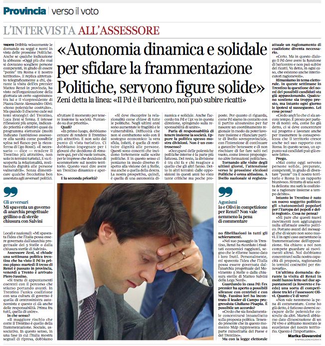 TRENTO Dribbla velocemente le domande su seggi e nomi in vista delle prossime Politiche. Anche se qualche indicazione la abbozza: «Oggi più che mai si dovranno scegliere persone competenti, in grado di essere “ponte” tra Roma e il nostro territorio». E replica altrettanto telegraficamente a chi, durante la visita dell’ ex premier Matteo Renzi in provincia, ha visto nell’ organizzazione della giornata un certo «agonismo» tra lui e il vicepresidente di Piazza Dante Alessandro Olivi: «Sono polemiche costruite». Ma quando il discorso cade sui temi strategici del Trentino, Luca Zeni si ferma. E intesse riflessioni più ampie, indicando priorità e obiettivi quasi da programma elettorale (molti indicano l’ ambizioso assessore alla sanità come possibile spina nel fianco per la riconferma di Ugo Rossi). «È necessario – dice – rendere il Trentino più attrattivo, non solo in termini turistici. E va riscoperta la relazionalità, restituendo dignità alle persone vulnerabili». Senza dimenticare qualche frecciatina ben assestata agli avversari politici. Locali e nazionali: «Mi spaventa l’ idea che l’ Italia possa essere governata dall’ anarchia progettuale dei 5 Stelle o dalla chiusura sterile di Salvini».