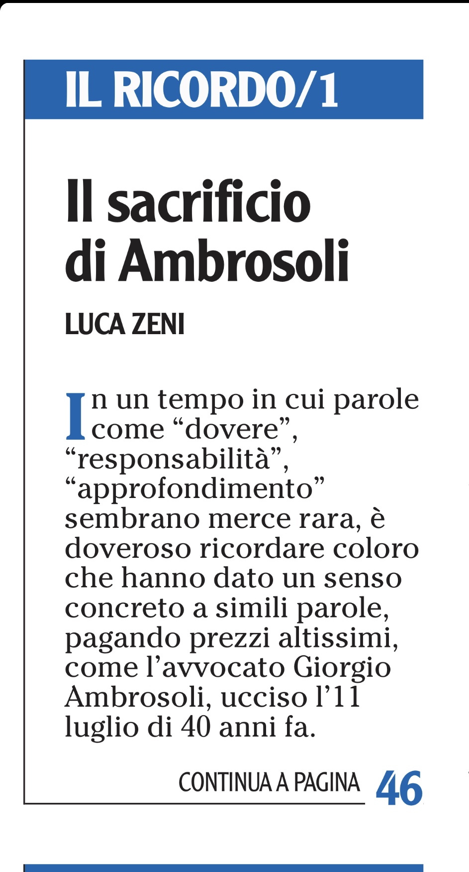 In un tempo in cui parole come “approfondimento”, “dovere”, “responsabilità” sembrano diventate merce sempre più rara, diventa doveroso ricordare coloro che, attraverso la testimonianza del loro agire quotidiano, hanno dato un senso concreto a simili parole, pagando prezzi altissimi, come l’avvocato Giorgio Ambrosoli, ucciso l’11 luglio di quarant’anni fa.