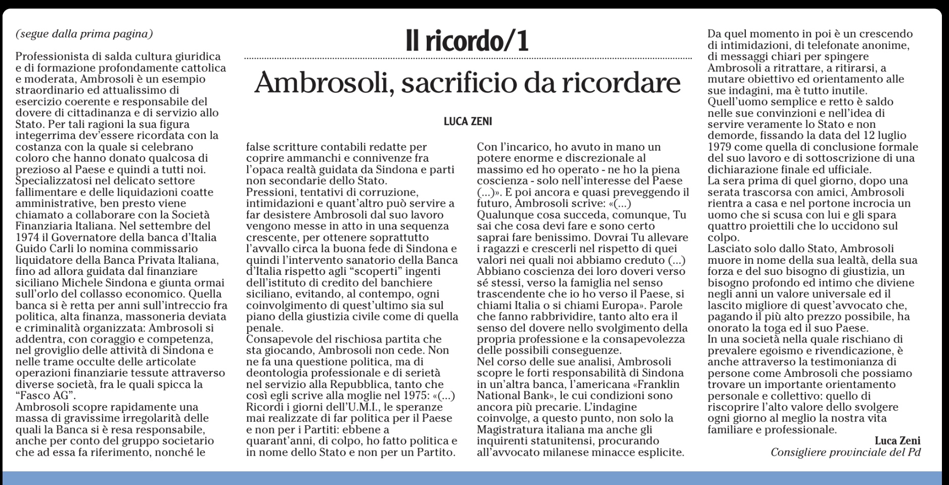 Professionista di salda cultura giuridica e di formazione profondamente cattolica e moderata, Ambrosoli è un esempio straordinario ed attualissimo di esercizio coerente e responsabile del dovere di cittadinanza e di servizio allo Stato. Per tali ragioni la sua figura integerrima dev’essere ricordata con la costanza con la quale si celebrano coloro che hanno donato qualcosa di prezioso al Paese e quindi a tutti noi.