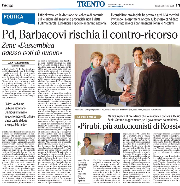In pillole la sintesi (mi scuso in anticipo per le evidenti semplificazioni, ma rileggere l’ultimo anno del Pd in maniera estesa sarebbe davvero lungo..), per chi non è appassionato del tema: nel 2014 si è svolto il congresso provinciale del Pd, che ha nominato segretario e assemblea; i tre candidati alla segreteria hanno ricevuto circa 1/3 dei voti a testa, e quindi si è costituito un quadro frammentato; nella primavera del 2015 una serie di vicende legate in particolare alle elezioni comunali, ha portato alla richiesta di dimissioni della segretaria; dimissioni che sono arrivate il 29 giugno 2015. Nel frattempo si è cercato di trovare un modo per avviare la fase congressuale dopo aver modificato una serie di disposizioni dello Statuto, in modo da evitare la frammentazione avuta fino a questo momento. Sembrava che l’accordo fosse siglato, con la nomina di Sergio Barbacovi a segretario, in modo da modificare le regole e svolgere il congresso entro l’anno, ma una serie di incomprensioni e la mancanza di fiducia reciproca ha portato ad un voto insufficiente per l’elezione (servivano i 2/3 degli aventi diritto, come prevede lo Statuto trentino e come ha sempre interpretato l’assemblea). C’è stato però un ricorso ai garanti, che hanno dichiarato Barbacovi segretario in virtù di un contrasto tra lo Statuto locale e quello nazionale, il quale prevede la maggioranza assoluta e non i 2/3.