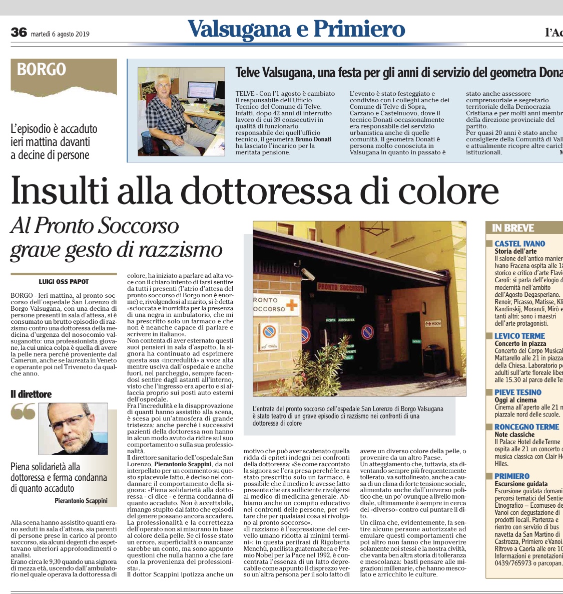 A Borgo in ospedale una donna se la prende con “una negra che non è neanche capace di parlare l’italiano”, e che è in realtà una dottoressa che l’ha appena visitata. A Levico e nei paesi vicini compaiono scritte naziste, inaccettabili e volgari, sui muri.