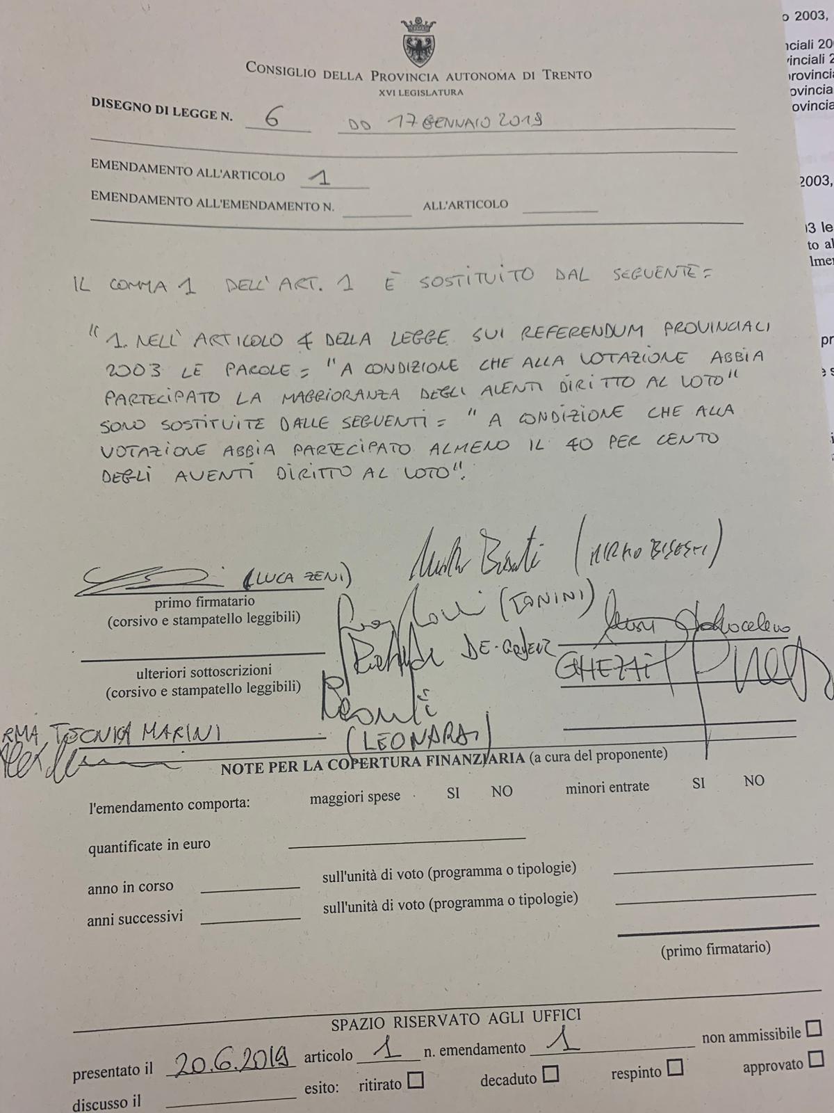 “La Lega Salvini Trentino non era per una volta d’accordo con Salvinia Roma – commenta Zeni – e abbiamo allora mediato su una percentuale fissa del 40%. Una quota che, pur discrezionale e non ancorata ad alcun criterio, migliora comunque il quorum oggi in vigore del 50% e rende più rischioso propagandare l’astensionismo per far saltare i referendum”.