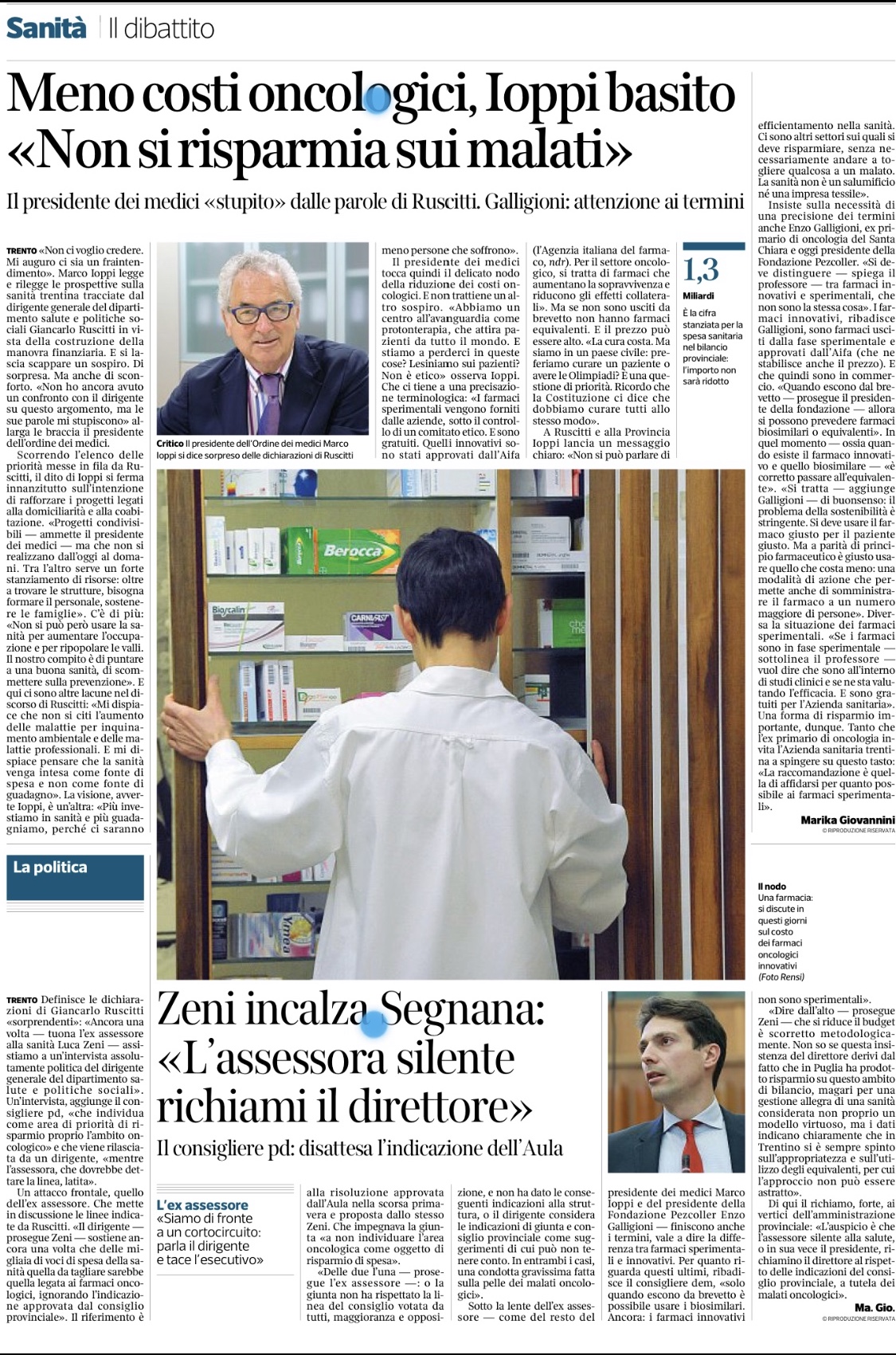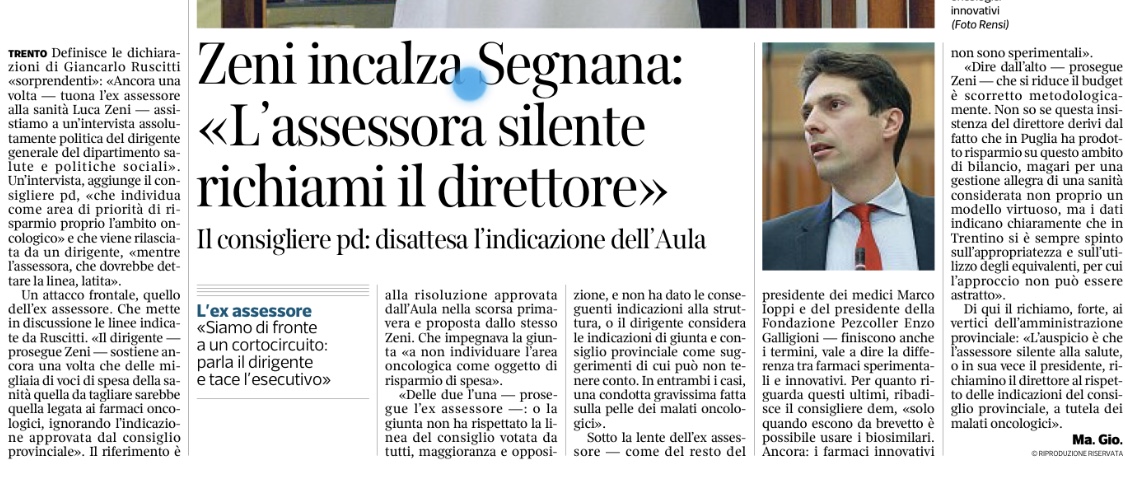Accanto a simile condotta formalmente deprecabile, dispiace poi rilevare anche nel merito la scorrettezza e la superficialità delle dichiarazioni rilasciate alla stampa. Per definizione infatti, i farmaci innovativi sono soggetti a brevetto, ed esistono precisi protocolli che lasciano all’oncologo la valutazione riguardo l’appropriatezza del farmaco. Dire dunque, dall’alto e a priori, che il budget per questi va semplicemente ridotto è metodologicamente scorretto. Il dubbio, in questo senso, è che il dirigente, privo di una guida politica, tenda a replicare schemi utilizzati nella gestione di altre sanità, magari meno virtuose della nostra, ritenendo possibili tagli copia-incolla e senza considerare che ciò che altrove può aver prodotto risparmio in un determinato ambito di bilancio, può rappresentare in altre realtà un ambito di condotta irreprensibile (nello specifico, i dati indicano chiaramente che in Trentino il livello di appropriatezza e l’utilizzo dei farmaci equivalenti è assolutamente virtuoso).