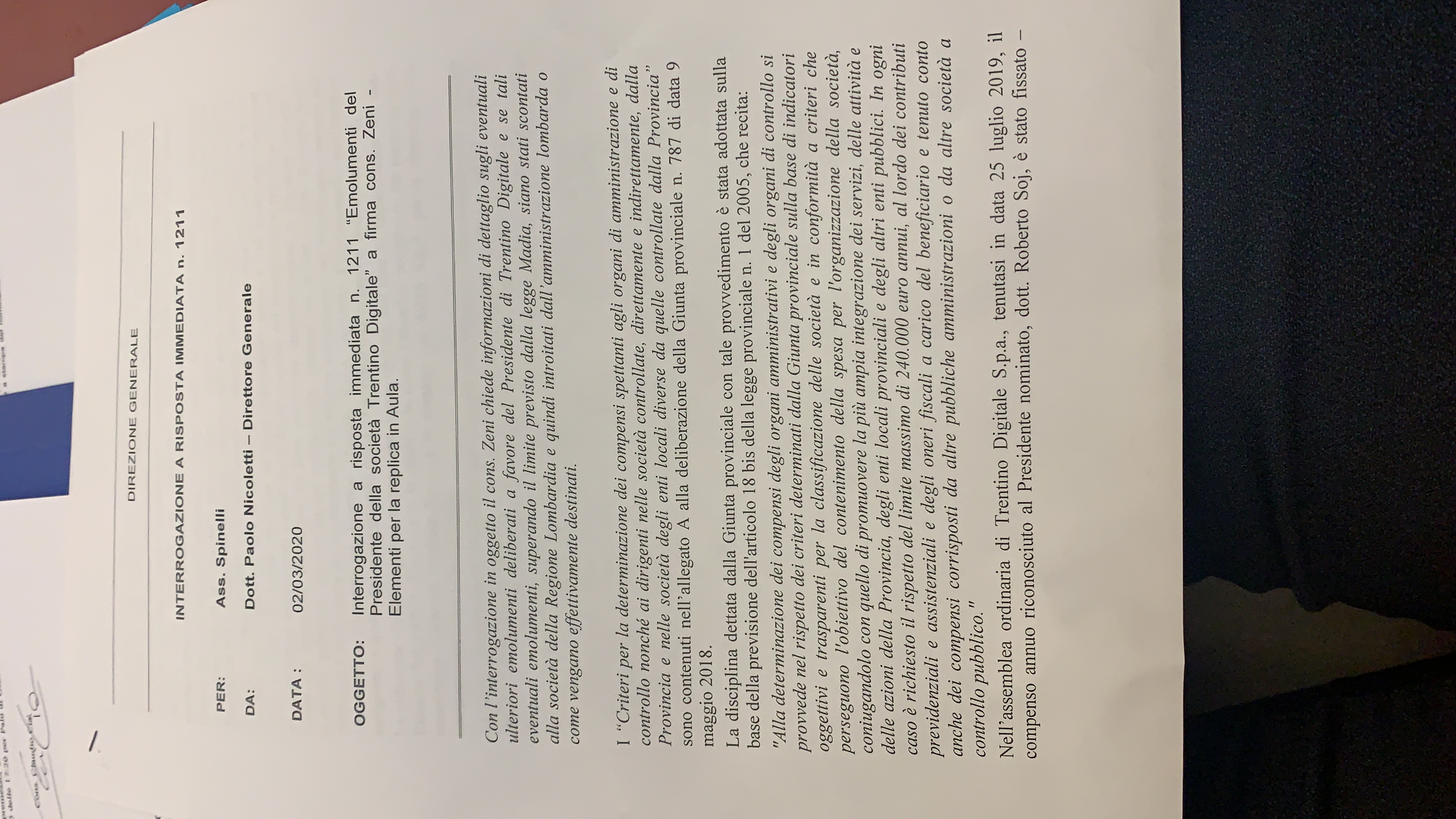 La conferma di questo è nella risposta consegnata oggi dall’assessore Spinelli ad un’interrogazione del consigliere Luca Zeni (in allegato). La giunta provinciale ha infatti scelto di aumentare i 39.000 euro di compenso del Presidente Soj di altri 20.000 euro negli scorsi mesi, ed in questo modo il tetto della legge Madia è stato superato di alcune decine di migliaia di euro (la cifra esatta non è stata riportata dalla giunta, che elide da mesi le domande puntuali sulla gestione di Trentino Digitale).