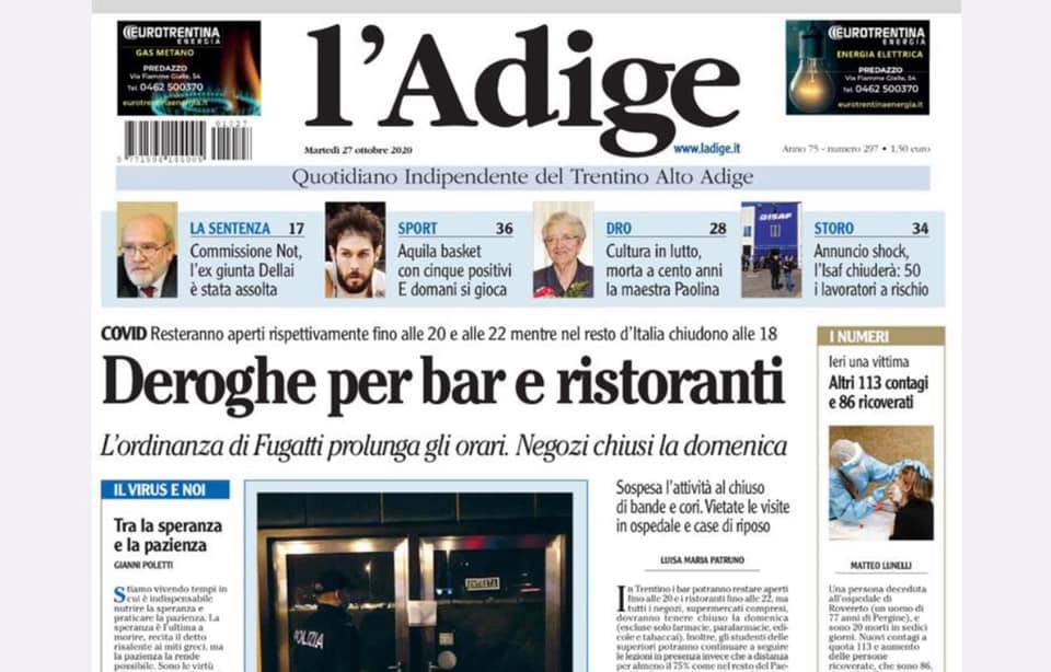 La giunta provinciale sta conducendo una gloriosa battaglia per tenere aperti alcune ore in più bar e ristoranti la sera (ma forse l’autonomia andava sfruttata per organizzarsi meglio per questa seconda fase..), e contestualmente “raccomanda fortemente” di evitare ogni occasione di contatto e di “rimanere in casa il più possibile”.