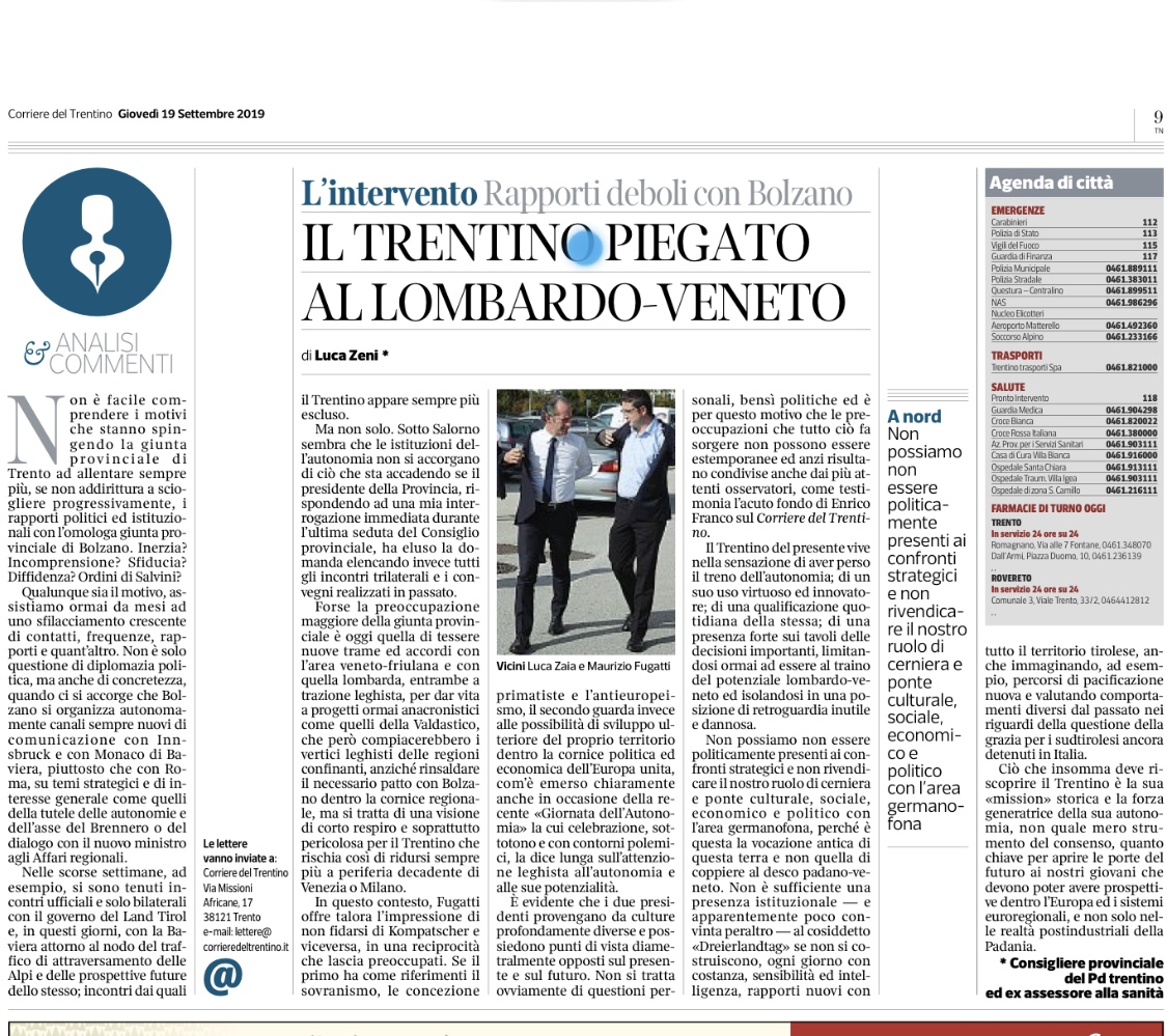 Forse la preoccupazione maggiore della Giunta provinciale è oggi quella di tessere nuove trame ed accordi con l’area veneto friulana e con quella lombarda, entrambe a trazione leghista, per dar vita a progetti ormai anacronistici come quelli della Valdastico, che però compiacerebbero i vertici leghisti delle regioni confinanti, anziché rinsaldare il necessario patto con Bolzano dentro la cornice regionale, ma si tratta di una visione di corto respiro e soprattutto pericolosa per il Trentino che rischia così di ridursi sempre più a periferia decadente di Venezia o Milano.