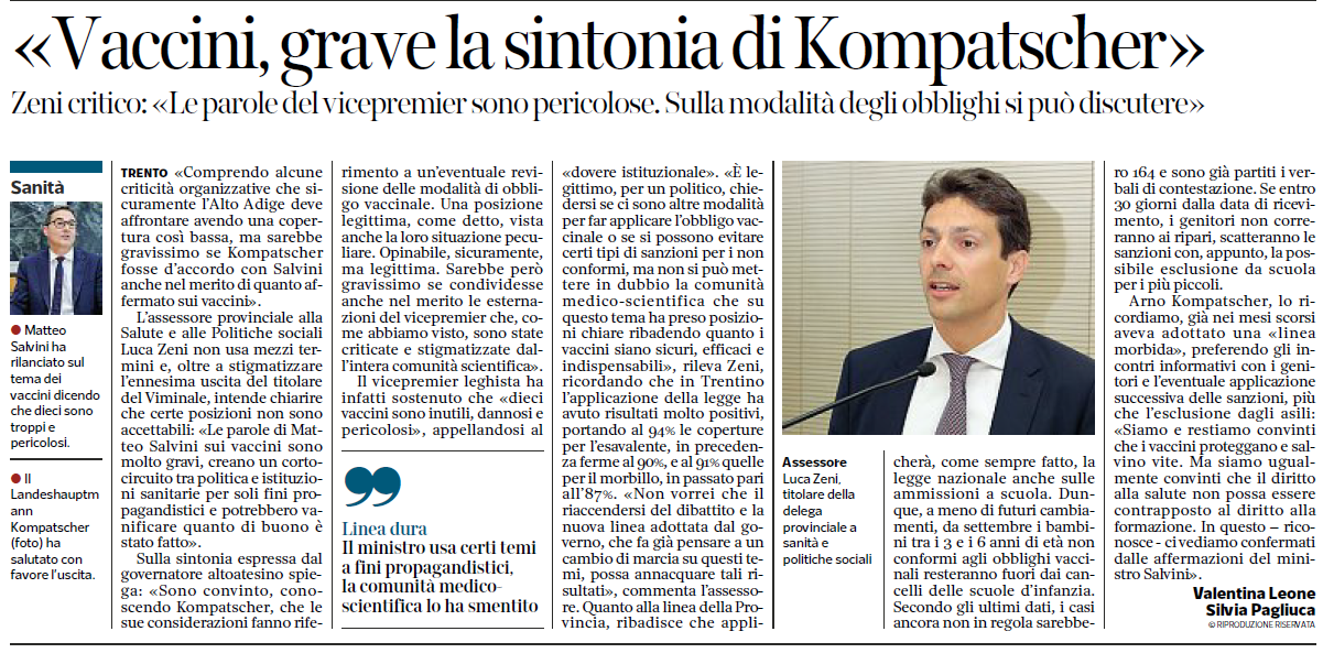 Il vicepremier leghista ha infatti sostenuto che «dieci vaccini sono inutili, dannosi e pericolosi», appellandosi al «dovere istituzionale». «È legittimo, per un politico, chiedersi se ci sono altre modalità per far applicare l’ obbligo vaccinale o se si possono evitare certi tipi di sanzioni per i non conformi, ma non si può mettere in dubbio la comunità medico-scientifica che su questo tema ha preso posizioni chiare ribadendo quanto i vaccini siano sicuri, efficaci e indispensabili», rileva Zeni, ricordando che in Trentino l’ applicazione della legge ha avuto risultati molto positivi, portando al 94% le coperture per l’ esavalente, in precedenza ferme al 90%, e al 91% quelle per il morbillo, in passato pari all’ 87%. «Non vorrei che il riaccendersi del dibattito e la nuova linea adottata dal governo, che fa già pensare a un cambio di marcia su questi temi, possa annacquare tali risultati», commenta l’ assessore. Quanto alla linea della Provincia, ribadisce che applicherà, come sempre fatto, la legge nazionale anche sulle ammissioni a scuola. Dunque, a meno di futuri cambiamenti, da settembre i bambini tra i 3 e i 6 anni di età non conformi agli obblighi vaccinali resteranno fuori dai cancelli delle scuole d’ infanzia.