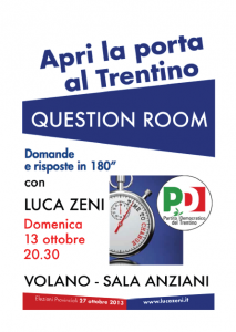 Domande e risposte rapide per confrontarsi in maniera concreta e diretta, senza i lunghi comizi a cui spesso la politica ci ha abituato. Parleremo del futuro del Trentino con Luca Zeni del Partito Democratico e con la partecipazione di Ugo Rossi candidato Presidente per la coalizione di centro sinistra autonomista alle prossime elezioni provinciali del 27 ottobre 2013